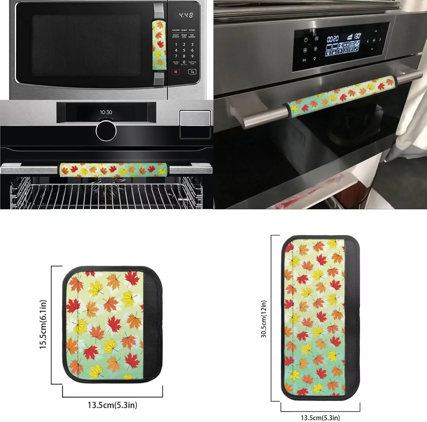 Dust and Grease Resistant Refrigerator Handle Glove Set Design This is removable, washable and reversible handle cover. And there are a variety of patterns and styles to choose from. Applicable Scene Refrigerator handle, oven, microwave, dishwasher and other kitchen appliance handles. Function Dust and dirt resistant while also anti-fingerprint and anti-static. It can be used as a decorative item to decorate the kitchen, making it more beautiful and neat. Set Includes Refrigerator Handle Gloves Set 2 pcs size: 12''L x 5.3''W, Microwave oven handle mitts 2 pcs: 6.1''L x 5.3''W. Refrigerator Door Handle Cover 2 pcs Size: 16.1''L x 5.3''W. Tips Please do not apply our products near the fire source. Data for manual measurement, there may be 1-2cm error The real thing may have a little deviation due to light or other objective reasons.
