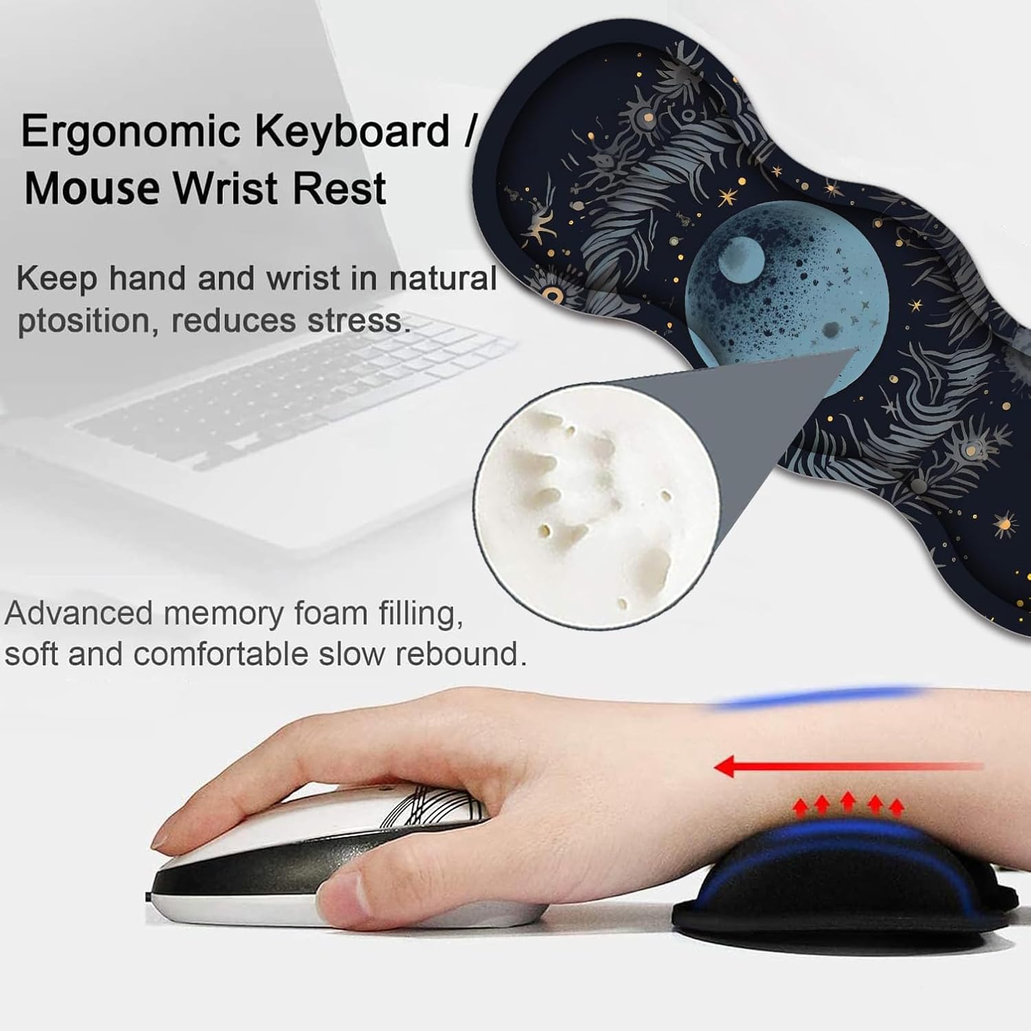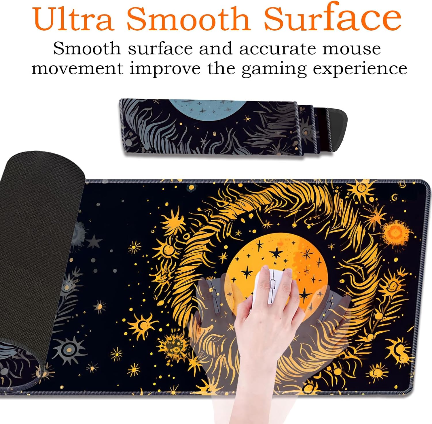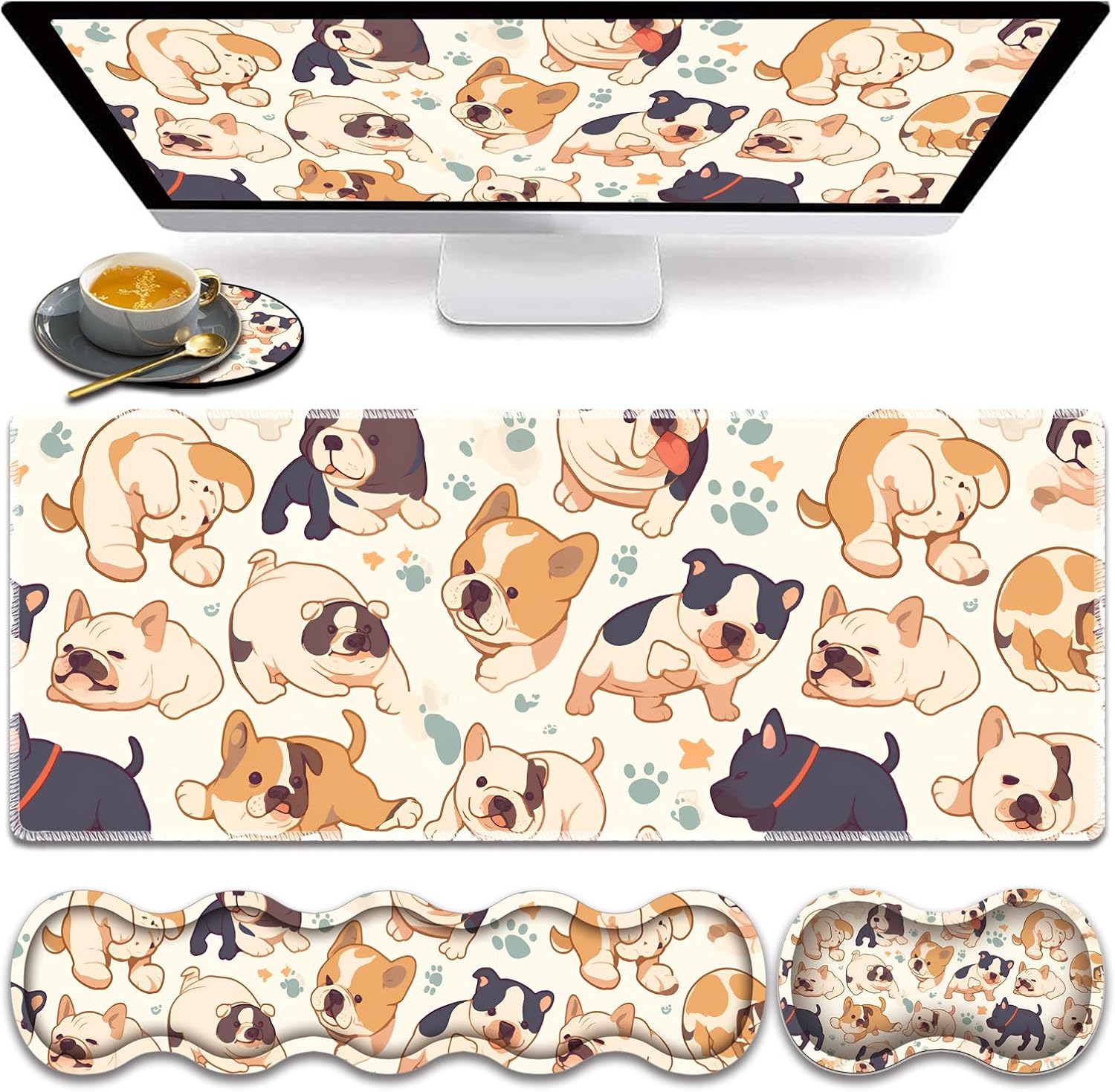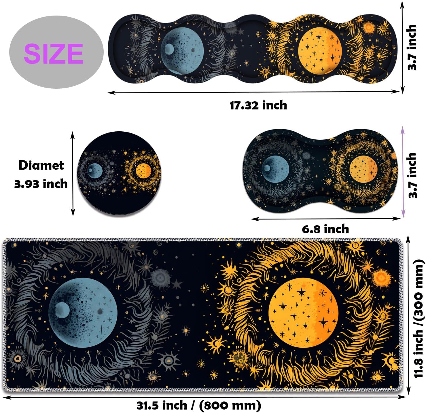 Large tabletop gaming mouse Pad and Keyboard wrist rest set, keyboard and mouse, light up your workspace with fun and beautiful design; Exquisite workmanship, work or play more comfortable.Features:High quality fabric surface promotes smooth mouse sliding and improves accuracy. The stable, thick, rubber base holds the mouse pad in place. Long-lasting stitched edges ensure long use without deformation and degumming.Keep it bright and clean after repeated use.Table Guard sets provide you with extremely comfortable work and gaming experience, is the best gift for men, women, esports professionals, gamers. A variety of styles are available.Specifications:Material: Surface Lycra fabric + bottom natural PU rubberFilling Material: Memory foamPackage Includes:1 x Big Gaming Mouse Pad1 x Keyboard Wrist Rest1 x Mouse Wrist Rest1x Coaster