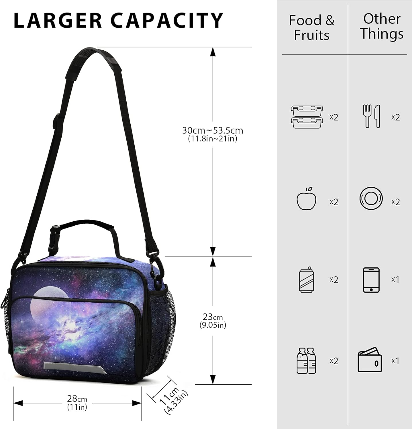 Healthier, Lighter, Happier Lifestyle for you, your family and your friend.High QualitySize: 11x 4.33x 9.05 inches, shoulder strap can be adjusted from 11.8" to 21".Material: 100% polyester fabric and heat welded insulated inside liner, which is durable, comfortable, waterproof and leakproof, rip-resistant and maximum durability. Double zipper: Advanced reinforced metal double zipper, secure zipper closure and metal buckle ensure smooth opening.Keep FreshKeep warm/cold: Food-grade aluminum foil will keep foods cold or warm for about 4~5 hours. Perfect to pack your delicious lunch foods.Refuse fast food: Let’s start your life of the convenient diet, you need not to order takeout or buy lunch from outside.Multiple uses: Suitable for picnic, street shopping, dinner, class study, outdoor travel, office work, etc. It also can be a perfect gift for your family and friends.Portable BagFriendly design: The detachable adjustable shoulder strap and hands-free buckle handle on lunch bag top ensure you more comfortable carrying options. Wide opening design makes it convenient to fill and carry food.Numerous Pockets: 1 main zipped compartment and internal mesh pocket could perfectly fit your lunch box, fruits, and tableware. 1 front zippered pocket could hold keys, cards & extra stuffs. 2 mesh pockets could place your water bottle and other drinks. Elegant Pattern Print Painstakingly pattern print design make you unique and fashion. Multi-print select: If you don't like this pattern, we have many other patterns in our store, welcome to our store to choose what you like.About Naanle Unique is our Naanle brand relentless pursuit, you will find your love in multiple products and pattern designs.Naanle makes your life easier and happier.
