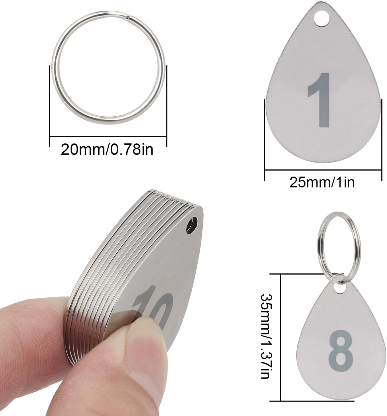 We have launched high - quality number tags made of sturdy industrial - grade 304 stainless steel. The numbers are laser - marked in black and will not fade. These tags measure 35mm in height * 25mm in width and have a thickness of 1mm. Each tag comes with a key ring with a diameter of 20mm, making it easy to attach to bags, keys, storage lockers, or any other items.Our number tags can be used in harsh environments. They have properties such as high temperature resistance, acid and alkali resistance, corrosion resistance, and oxidation resistance, which means they will not rust or lose their luster. This makes them highly suitable for use in places like swimming pools, shopping malls, gardens, schools, swimming complexes, apartments, factories, and restaurants. The clearly legible numbers ensure quick identification.