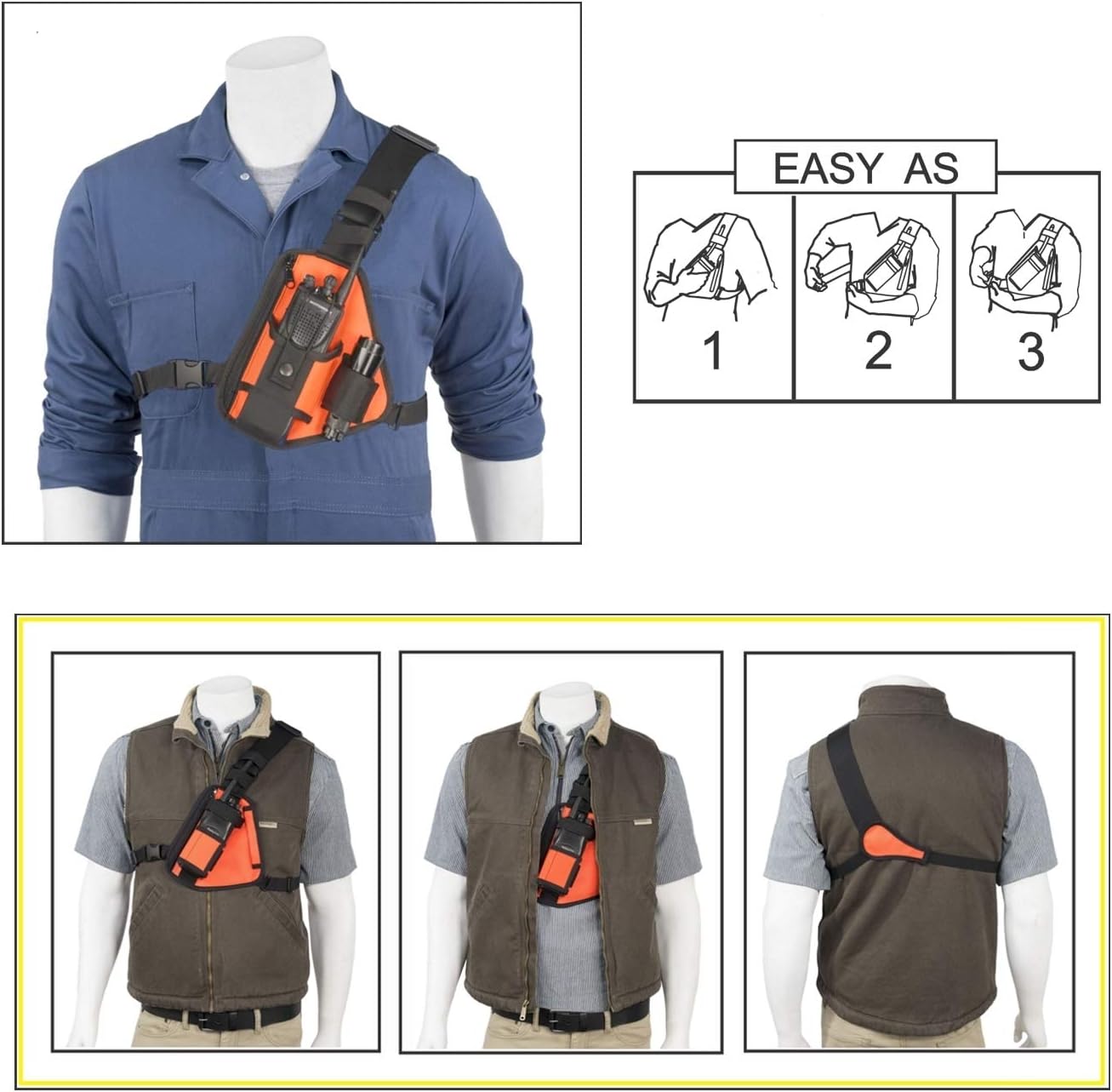 The RCH-101ORU Patented Orange Universal Radio Chest Harness is a low profile two way radio carrying solution. The height adjustment radio pouch will allow your medium to large two way radio to fit perfectly in this radio holster. Has three torso adjustment tabs to provide maximum comfort. Creates a "Hands free" working environment, holds your radio safe and secure on the upper left side of your chest. Other features include a zippered rear pocket for storage of small items. Chest harness can also be worn inside or outside most jackets and vests. Adjustable Velcro pouch will hold radio's 4-3/4" to 9" tall radios. Fully adjustable to fit both men and women. Handmade in the USA *** RADIO AND TOOLS OR SUPPLIES PICTURED ARE NOT INCLUDED***