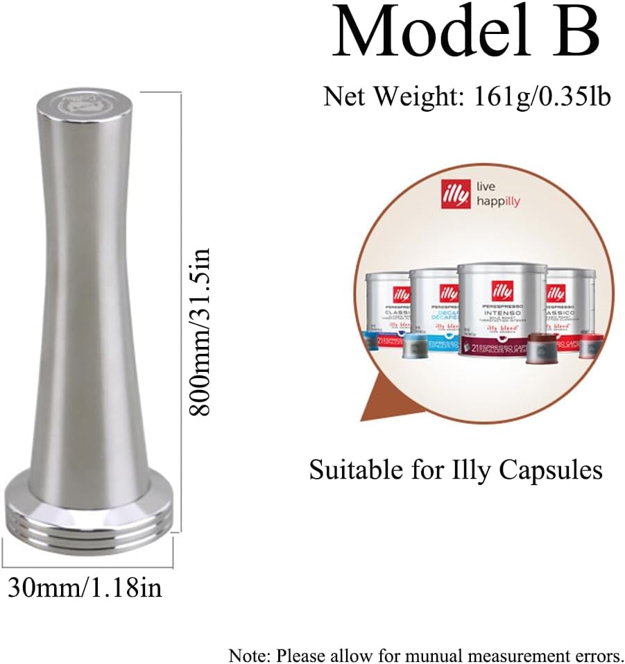 Specification:Material: 304 Stainless SteelModel: A, B, CASize: 800*24mm/31.50*0.94inNet Weight: 122g/0.27lbSuitable for Nespresso CapsulesBSize: 800*30mm/31.50*1.18inNet Weight: 161g/0.35lbSuitable for Illy CapsulesCSize: 800*41mm/31.50*1.61inNet Weight: 193g/0.42lbSuitable for Dolce Gusto CapsulesNote: Please allow manual measurement error.Package Included:2 * Coffee Capsule Powder Press